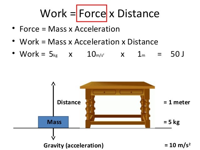 Presentation Name on emaze from userscontent2.emaze.com If the force is 2 newtons, the distance is 5 m and the mass is 0.7 kg, for example: Work done to lift an object of mass m a height h: How to find work given mass and distance? See full list on wikihow.com The equation for work can be rearranged to find force or distance if the other variables are known. How much work is required to lift a 4.0 kg concreted block to a height of 2.0 m? Dec 08, 2020 · substitute the measurements for force, distance and mass into the equation. How to calculate the magnitude of a force?